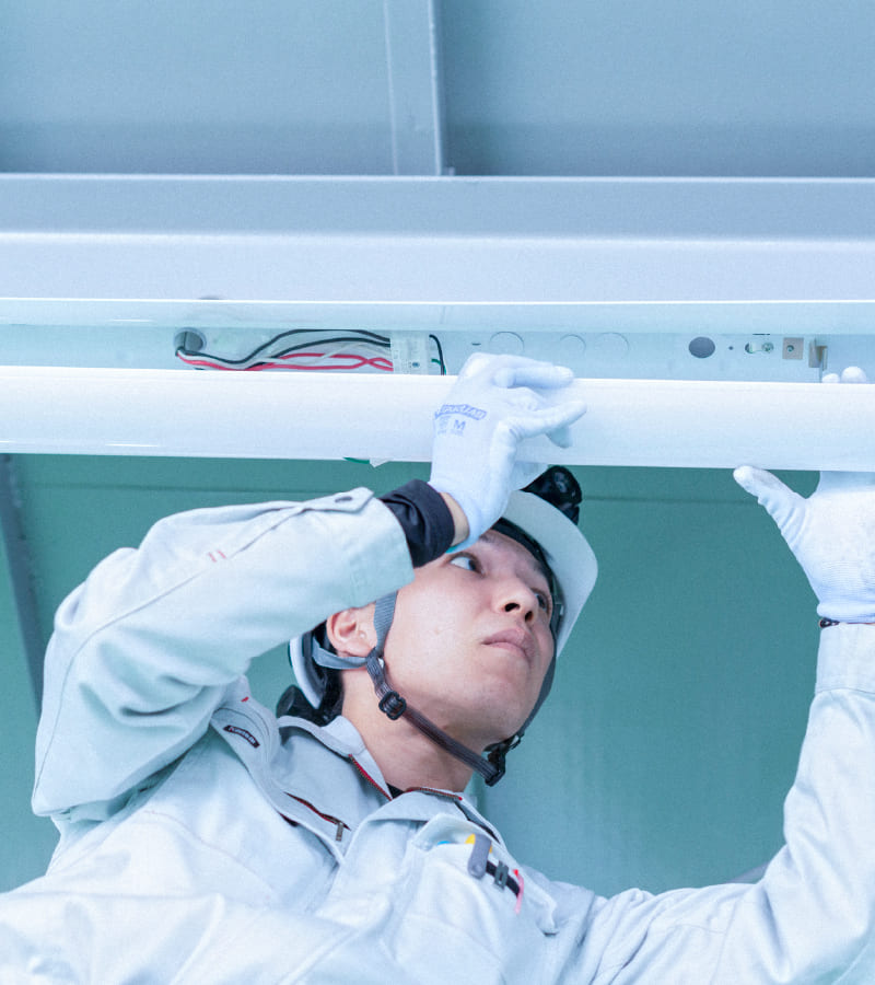 さまざまな機器を作動させるのに必要な各種電気工事も承っています。機械設備の機内配線やロボットラインの構築、工場内の照明工事など、幅広い電気工事に対応しています。